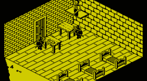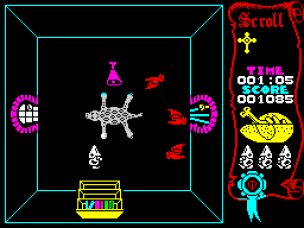 Your inventory is used instead to store the artefacts that are scattered around Atic Atac’s castle. The most important of these artefacts are the three sections of the Golden Key of ACG, used to unlock the mansion’s main door and escape. The game implies that ACG is part of an ancient spell or incantation but it actually stands for the far less occult Ashby Computer Graphics, Ultimate’s parent company. After this come the smaller, coloured keys that - foreshadowing Doom by a decade - open doors of the same colour, allowing you to explore the mansion more thoroughly. Atic Atac also looks forward to the inventory management of games like Resident Evil as the three parts of the Golden Key need to be assembled into its complete form and there are four of the smaller coloured keys, more than your three inventory spaces. Finally, there’s a smattering of random items like a crucifix, a spanner and, for reasons I never discovered, what looks like a turnip. Many of these are useless red herrings but a handful, when used correctly, give you an advantage against some of the mansion’s denizens.