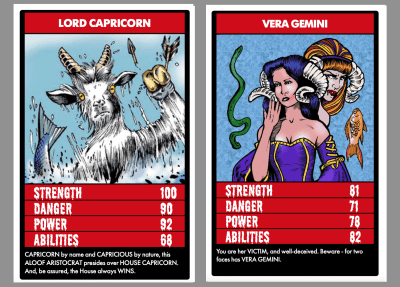 We made some changes along the way, creating modifier cards that could affect a game, adding that much-missed flavour text to each card, and slimming down the categories for our own purposes. Like the originals, we wanted to create our own feel, our own nods and winks to classic characters, and our own