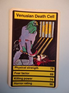 It was a tribute to the artists that, with no blurbs (“flavour text”, in the industry), no background info, and no particular franchise to pin these on, the cards still seemed to have whole stories tucked into their shadowy depths. These days it’s easy to discover the Venusian Death Cell was just a repurposed Sea Devil from Doctor Who with the horror level cranked up to 11, but at the time, that single image accompanied by the evocative name was enough to let a young mind wander-“Wow, things are harsh on Venus!”