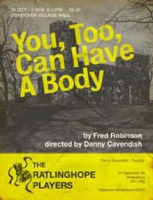 As I was leaving the town library one evening, I spotted a half-concealed poster for a play. You, Too, Can Have a Body, the title called out to me, beckoning a smile. By a group called the Ratlinghope Players, at somewhere called Condover Village Hall. The final performance was that night, so I just went. Having not seen any amateur dramatics previously, on the drive out I had it in my head that it would be, well, amateur. And that’s what it was. The play, farcical and frantic as the script intended, suffocated beneath mostly weak performances. It also probably didn’t help that of sixty or so chairs put out, the actors played to an audience of eleven including me. I had sat at the back, near the door. Just in case it was unbearable. But something made me stick it out. Unlike my fellow attendees I tried to make an effort, laughing at any overtly funny bits; to not to just seemed stubborn. Not that it made me feel any better as every time I did I laughed alone. You’d think by the final night a production might be tighter, having settled-in to itself. But no. The director, Danny as it would transpire, lurked beneath the foot of the stage, script in hand, prompting any especially forgetful cast members around every few lines or so.